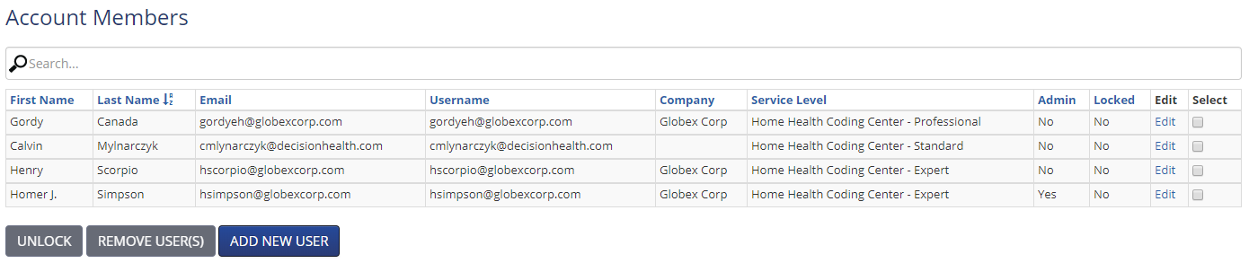 The Account Members table displays the first name, last name, email address, username, company and service level for each user on your account. It also will display if a user(s) have been locked out for trying to unsuccessfully log into the Coding Center too many times.
